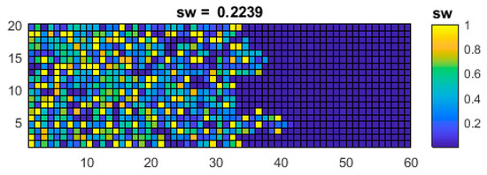 Using the obtained pore network for Barnett shale, the initialization is conducted by setting every pore and throat element to have the local capillary pressure . Then, boundary conditions (Equation (17a) through (17d)) are applied in our dynamic pore network model, and the upper and lower boundaries are set as periodic. The water imbibition process can then be simulated directly within this proposed dynamic pore network model representing Barnett shale. Figure 4 shows the effect of the network size on the simulated spontaneous imbibition recovery with respect to time. We can see that a size of 20 × 60 is sufficient to capture the accuracy and efficiency for the following studies. The water saturation profiles of the water imbibition process are shown in Figure 5, where the average water saturation equals 0.2239. Note that the contact angle is set as 60° as the advancing contact angle is larger than the intrinsic contact angle due to the hysteresis effect [48]. All the mentioned conditions are set as the base case.