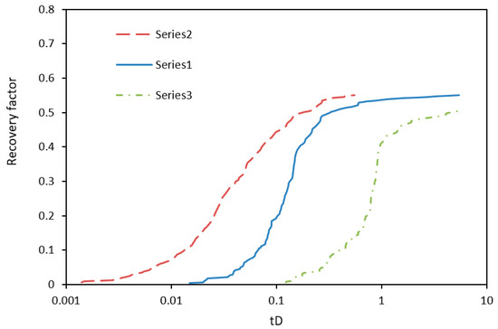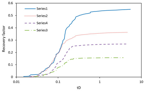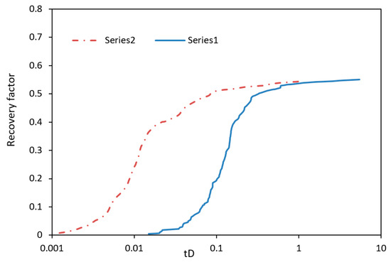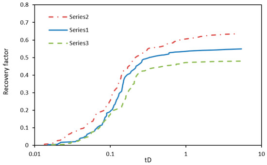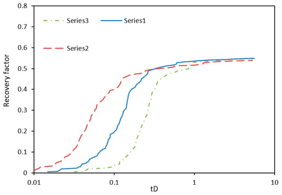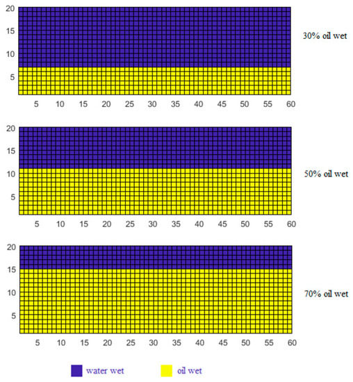 Generally, a mixed wettability is assumed for shale and tight formations. Here, we considered mixed wet conditions for Barnett shale. We assigned three types of mixed wet conditions—30% oil-wet, 50% oil-wet and 70% oil-wet—as shown in Figure 6. The corresponding spontaneous water imbibition-induced oil recoveries are shown in Figure 7 for dimensionless time , where is the unit conversion factor, which is equal to 0.018849 if is in minutes, in md, in decimal, in , in cp, and L is a characteristic length in cm [49]; we follow the same units here. According to the figure, with the increasing proportion of oil-wet pores, the imbibition rate and recovery factor decrease dramatically. The results indicate that wettability dominates the water imbibition characteristics.