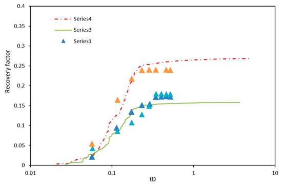 Based on the above analysis, the simulated imbibition recovery factor with respect to dimensionless time is compared with the laboratory experimental work of Barnett shale samples by Morsy and Sheng [16]. The corresponding results are shown in Figure 10. Both the effects of wettability and micro-fractures are considered to fit the experimental data. Mixed wettability for Barnett shale is found within the fitting process. Since micro-fractures are observed in the imbibition experiments, the characteristic length is reduced significantly. In the fitting results, the effective characteristic length of Barnett shale samples is approximately several millimeters, and the fraction of oil-wet pores ranges from 70% to 50%.