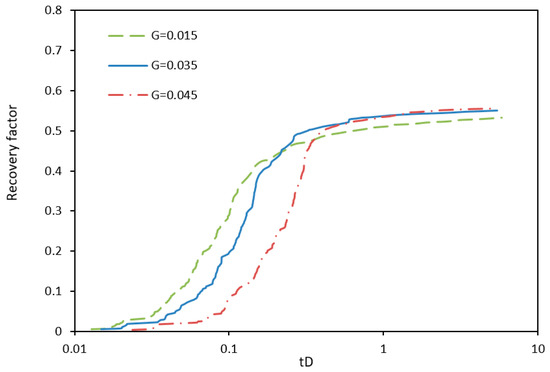 To further investigate the capillarity effect on the water imbibition of Barnett shale, the following sensitivity studies are conducted: the determination of the pore throat aspect ratio, contact angle and shape factor of the cross-area. The corresponding results for the water imbibition recovery factor with respect to dimensionless time are shown in Figure 13, Figure 14 and Figure 15, respectively. A higher aspect ratio tends to increase the percentage of the non-wetting phase trapped by the snap-off effect, which increases the residual non-wetting phase saturation and hence the final recovery factor (c.f. Figure 13). When the contact angle and cross-area shape factor decrease, leading to an increase of capillary pressure, the imbibition rate increases at the beginning. However, the final recovery factor decreases slightly (c.f. Figure 13 and Figure 14) because snap-off tends to occur more frequently with a lower contact angle and shape factor, as shown in Equation (13).