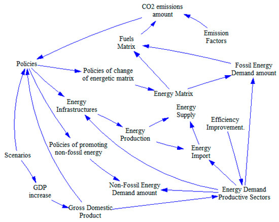 The evolution and integration of the model across modules requires, for each time step, the energy demand and supply to be balanced dynamically. The system was designed to establish energy policies and CO2 emissions in Ecuador in 2030. The traditional energy resources of the country are also considered. The impact of economic growth on energy consumption and CO2 emissions is analyzed. The flowchart of the economic–energy–carbon emissions system is shown in Figure 1. The energy consumption of each of the economic sectors generates CO2 emissions.