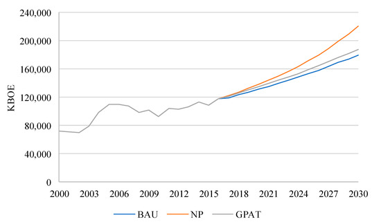 An increase in final energy demand by 2030 can be observed (Table 1). This will increase by 3.3 times in the BAU scenario if the current characteristics of energy consumption are maintained, which projects high and inefficient consumption. Maintaining current consumption habits would require Ecuador to significantly increase energy production; one should even consider importing hydrocarbons due to the incredibly high national energy demand. The lower projections raised by the PN (National Policies (NP) scenario) and PYTM (Global Policies and Trends scenario (GPAT)) scenarios, reducing the energy demand by 2.6 and 1.8 times, respectively, could be associated with a government policy to replace energy sources and improve energy efficiency. The BAU scenario projection shows a final energy demand of 184,345 KBOE. The NP and GPAT scenarios project an energy demand of 134,193 and 103,521 KBOE, respectively; this is due to the higher efficiency of electrical energy (Figure 3).