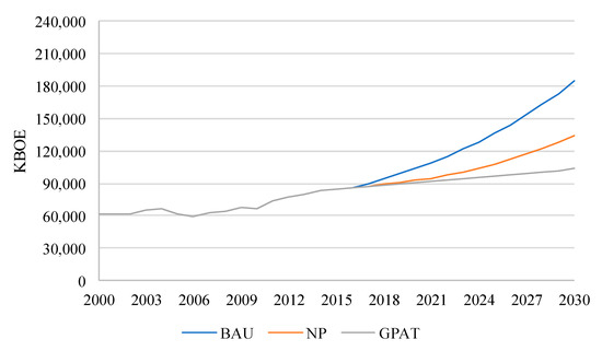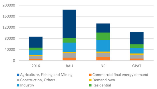 The projected reduction in relation to the BAU scenario is probably the result of the promotion of the use of biofuels and the use of electricity in mass passenger transport nationwide. Another sector that shows an increase in final energy consumption is the industrial sector, for which an energy transition has been proposed—a change in production equipment.