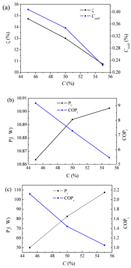 The effects of the initial concentration of LiBr solution in the electrodialysis regeneration system on the energy consumption and COP of the system under theoretical and experimental conditions are respectively shown in Figure 3b,c. When the initial concentration of LiBr solution was increased from 45% to 55%, the energy consumption of the system increased slightly under theoretical conditions, and the theoretical COP of the system decreased from 9.17 to 5.46.