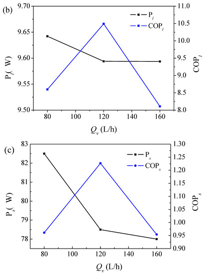 The effects of solution flow rate in the channel on the system energy consumption and system performance under the theoretical and experimental conditions in ED regeneration for LiBr solution are respectively shown in Figure 4b,c. Increasing the flow rate can save energy for the system.