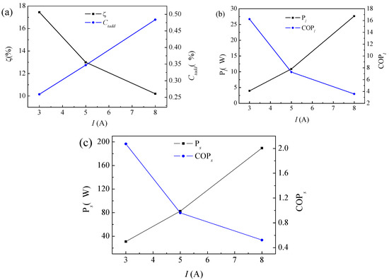 The effects of current on the performance of the system and energy consumption under the theoretical and experimental conditions of the electrodialysis regeneration system for LiBr solution are respectively shown in Figure 5b,c. With the increase in current, the energy consumption of the system increases rapidly under both theoretical and experimental conditions, and the COP of the system continues to decrease. When the current is increased from 3 to 8 A, the system energy consumption increases from 3.915 to 27.84 W under theoretical conditions, and the system performance coefficient decreases from 16.237 to 3.584; under the experimental conditions, the system energy consumption increases from 30.9 to 189.6 W, and the system performance decreases from 2.073 to 0.523.