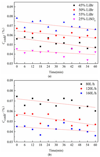 The regeneration performance of the electrodialyzer with different initial concentrations is shown in Figure 3a. When the initial lithium bromide concentration was increased from 45% to 55%, the current efficiency of the electrodialyzer to regenerate the lithium bromide solution decreased from 14.72% to 10.73%. At the end of the experiment, the lithium bromide solution concentration in the regeneration tank decreased from 0.408% to 0.224% with the increase of the initial lithium bromide concentration. This is due to the increase in the initial concentration, which continuously increases the viscosity of the lithium bromide solution, which leads to a decrease in the regeneration performance of the electrodialysis regenerator.