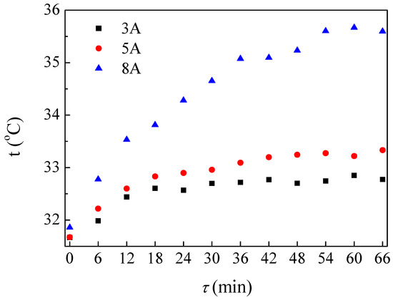 It is concluded that, when the current increases, the temperature difference of the regenerate desiccant solution increases continuously at the end of the test; when the current is 3, 5, and 8 A, the temperature of the regeneration solution increases by 1.1, 1.6, and 3.7 °C, respectively. As we can see from the figure, the temperature of the regenerate solution will keep constant after rapidly increasing at the beginning of the test. When an electrodialyzer is used to regenerate LiBr solution, the solution temperature rise is limited, and the desiccant solution does not need to be cooled before entering the dehumidifier, which decreases the system energy consumption.