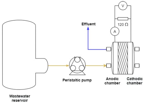 The anodic compartment of the MFC was seeded with activated sludge from the Ciudad Real Wastewater Treatment Plant, more information about this facility can be found elsewhere [66]. Then, the mixed microbial culture was acclimatized during four months to the MFC operational conditions. To do this, the anodic chamber was connected to a 0.25 L auxiliary tank. This tank was filled the first day with 0.2 L of activated sludge and 0.05 L of wastewater. The liquid bulk was recirculated during the first day at a flow rate of 0.75 L/d. Every day, 0.05 L of the liquid bulk of the tank was purged and replaced by fresh synthetic wastewater. The biochemical properties of the synthetic water used in this work allow it to be assumed to be neutral for microbes inside of MFC. Once acclimatized, the MFC operated in a continuous mode and the wastewater was fed, at a flow rate of 0.75 L/d, from a sterilized synthetic wastewater container of 5 L. The sterilization process was carried out at 105 °C for 30 min [67].