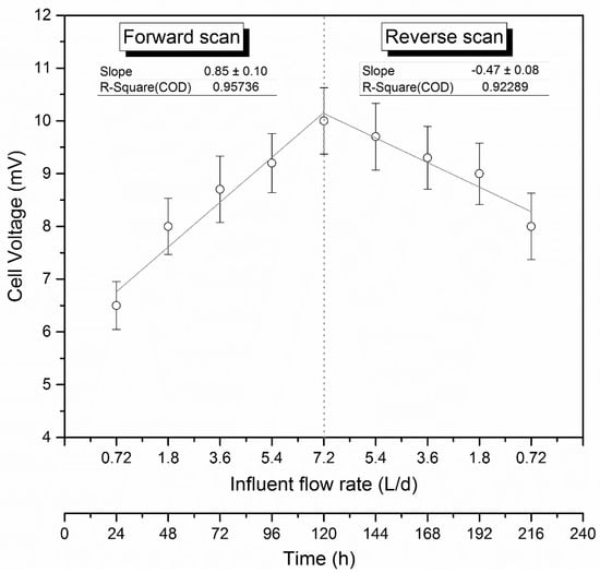 As can be seen, the exerted voltage drastically increased, from 6.5 to 10.0 mV, when the influent flow rate increased from 0.72 to 7.20 L/d. It could be explained by the fact that high flow rates increase the organic load available for microbial oxidation. This behavior has been also demonstrated by Gude [71], who reported that higher organic loading rates (OLR) resulted in higher electrical energy outputs. In addition, an increase in the flow rate generates turbulence. Both factors, i.e., the higher OLR and the higher turbulence, led the system to a more efficient mass transfer in the biofilm. This facilitates the diffusion and proton-motive potentials, causing, therefore, better electrochemical performance of the MFC in terms of electric power generation [72]. As can be seen in Figure 2, during the forward scan a linear trend with a slope of 0.85 mV per L/d increased in the flow rate was observed, presenting a regression coefficient of 0.957. Once the forward scan had been finished, a reverse scan was performed and a reduction in the exerted voltage, from 10.0 to 8.0 mV, was observed. During the reverse scan, a linear trend was also observed. However, the reduction in the exerted current density was lower than expected, 0.47 mV per each L/d decreased in the flow rate, regression coefficient 0.923, exerting in all the cases voltages higher than those obtained in the forward scan when operating at the same influent flow rate. The different behavior in the forward and reverse scans defined a hysteresis loop. This behavior could be explained by the growth of electrogenic microorganisms or by enhanced electrogenic metabolisms developed during the experiments performed at high flow rates [48]. In order to identify whether the increase in the electric power generation was linked or not to higher COD removal, the mineralization of the effluent was evaluated. To do that, the influent and effluent COD was analyzed, and the COD removal efficiency and COD removal rate were determined. In Figure 3, the COD removal efficiency and the COD removal rate are presented as functions of the influent flow rate.