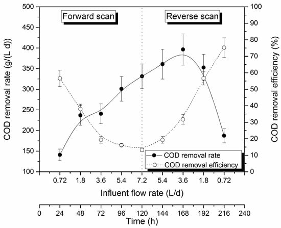 On the one hand, as can be seen in Figure 3, the increase in the flow rate from 0.72 to 7.20 L/d significantly increased the COD removal rate from 141.1 to 331.6 g/(L/d). This enhancement presented a linear trend. This trend was maintained even when the reverse scan started. When decreasing the flow rate from 7.2 to 5.4 and then to 3.6 L/d, the COD removal rate increased up to 396.4 g/(L/d). This behavior could be explained by the inertia of the MFC. In the literature, it has been interpreted that the exposition to high OLR could result in biomass growth and/or in an increase in the microbial enzymatic production in order to degrade as much COD as possible [48,73]. In this case, the effect was maintained during about 60 h indicating that it could be explained by an enhanced enzymatic activity. Then, when decreasing the flow rate down to 0.72 L/d, the COD removal rate decreased to 187.5 g/(L/d), yielding in all the cases COD removal rates higher in the reverse scan than in the forward one. This trend defined a maximum COD removal rate of 396.4 g/(L/d) obtained in the reverse scan when the influent flow rate was 3.6 L/d.