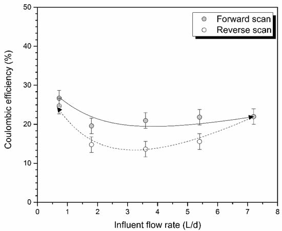 In order to evaluate the change in the efficiency of the chemical energy conversion into electrical energy, the CE was determined in both the forward and the reverse scans. Figure 4 presents the effect of the influent flow rate on the CE in both forward and reverse scan. It can be seen that the CE decreased from 27% to 20% when the flow rate increased from 0.72 to 1.8 L/d. Then, the CE was maintained about constant when increasing the flow rate from 1.8 to 7.2 L/d. In the reverse scan, when the flow rate was decreased, the CE decreased from 22% to 14%. Finally, the CE drastically increased, reaching 25%, when the flow rate was reduced to 0.72 L/d. Moreover, Figure 4 shows that the CE obtained for the same flow rate is lower in the reverse scan than in the forward one, confirming the change in the behavior of the microbial culture. The trend presented by the CE can be explained by the fact that the COD removal increased more than proportionally to the electrical energy exerted, as seen in Figure 2 and Figure 3. Thus, although the microorganisms degraded more COD in the reverse scan, they used less substrate to electric power generation, yielding a lower CE value.