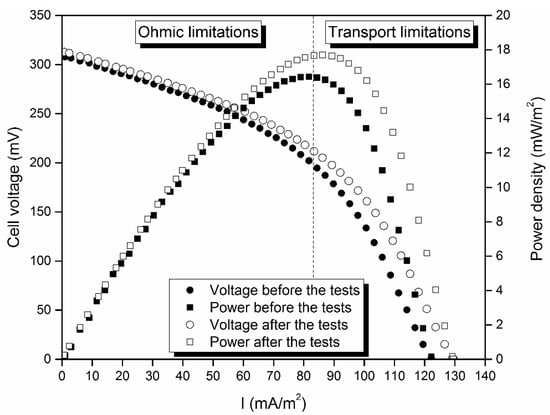 The theoretical fuel cell polarization curves have three regions where different types of losses reduce the exerted current: (1) The kinetic limitation is dominant at low current densities, (2) the ohmic limitation governs the intermediate region, and (3) the transport limitation is found at high current densities [1]. In the polarization curve obtained in this work, see Figure 5, only the ohmic and the transport limitation regions were observed. It means that the main limitations were ohmic losses and mass transfer losses. On the one hand, the ohmic losses arose from the resistance corresponding to ion conduction, due to the solution and the membrane, but also due to the flow of electrons through the electrode. On the other hand, the mass transfer losses mainly arose when the flux of reactants to the electrode or the flux of products from the electrode were insufficient, limiting the rate of reaction. It can be observed that the drop related to the ohmic losses softened after the flow rate tests and the same behavior was observed in the mass transfer losses. Therefore, limitations were partially overcome after performing the experiments with higher influent flow rates. In order to evaluate these facts, Table 2 shows the maximum power and current density exerted by the MFC before and after the flow rate tests.