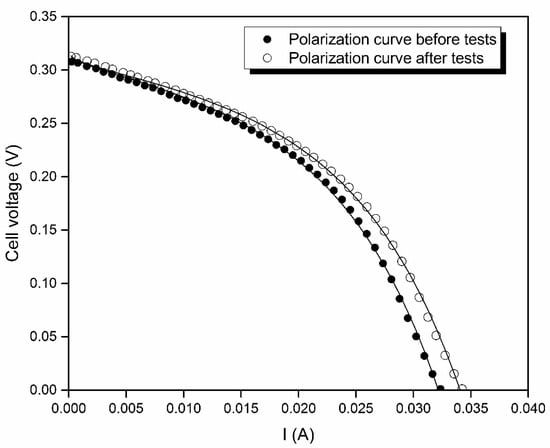 In order to determine the short-term effects of the influent flow rate modifications on the MFC performance, polarization curves before and after the step-wise flow rate tests were modelled. Both tests were performed at a flow rate of 0.72 L/d. Figure 5 presents the obtained polarization and power density curves which were slightly different, indicating that the changes in the influent flow rate experienced during the test influenced the MFC behavior. From these polarization curves, the maximum power density, the OCV, and internal resistance were determined.