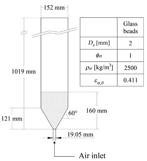 Vast experimental studies on spouted beds have been conducted by our research group and has been reported on a series of contributions from recent years [10,11,12,13,14,15,48]. The apparatus used on these experimental studies corresponds to the one shown in Figure 1, and another scaled-down unit based on the setup shown in Figure 1. In order to assess the effect of the solid particles’ properties, different particles were used, such as glass beads and steel shots of different diameters. Accordingly, several operation conditions, such as different inlet gas flow rate and static bed height, were tested and reported on these previous contributions.