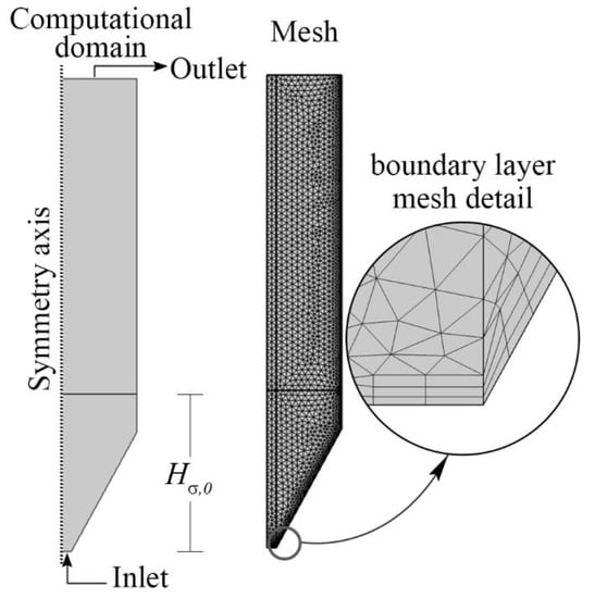 In our previous studies [10,11,12,13,14,15,48], it was observed that the solids holdup and velocity fields are axisymmetric [10,13]. Tests with different measurement techniques, under different operation conditions, and using different solid particles, have demonstrated such axisymmetric behavior [10,13]. In fact, the symmetry in the solids trajectories is one of the main advantages of spouted beds over traditional fluidized beds [3,8]. Considering this, the selected computational domain corresponded to a 2D axisymmetric domain. Details of the computational domain, the implemented mesh, and the mesh boundary layer refinement can be seen in Figure 2.