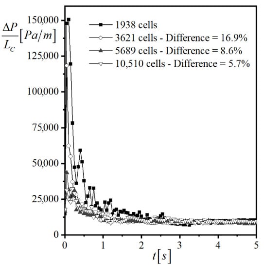 Sample of the mesh independency analysis, considering the pressure drop per unit length as metric, for a spouted bed packed with 2 mm glass beads, and .
