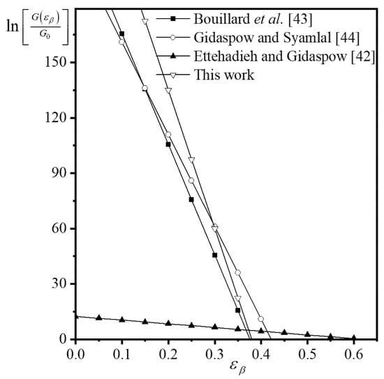 As far as the authors are concerned, there is no modulus of elasticity developed specifically for spouted beds. In fact, most of the experiments conducted to determine the modulus of elasticity were conducted using fine particles [39,40,42,53], while spouted beds are commonly used to handle coarse solid particles. Hence, it could expect that the currently available modulus of elasticity sub-models are not suitable for spouted beds modeling. In order to obtain a modulus of elasticity for spouted beds, the early contributions of Orr can be considered [54], which, as formulated by Bouillard et al. [43], show that a generalized form of the modulus of elasticity can be described by Equation (8).