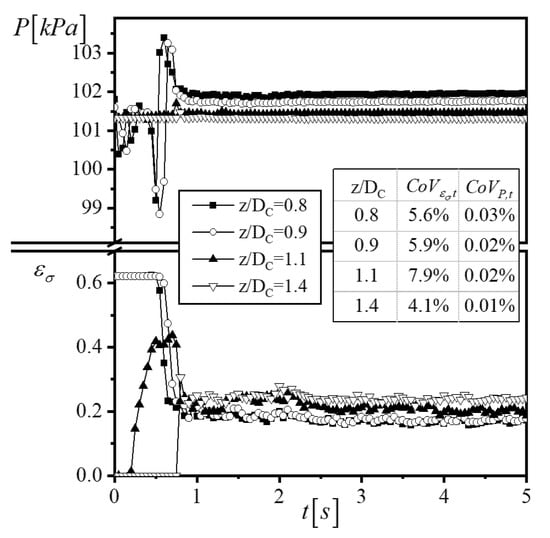 where is the total time simulated, which varied depending on the case. For the shallow spouted beds the steady operation was obtained after one second, and hence, a physical time of 5 s was enough to obtain a representative time average. However, for the cases with a physical time of 10 s was required, as the steady state took longer to be reached, in around 2 s. Figure 5 shows the timewise series of the absolute pressure and solids holdup evaluated in the center line of the computational domain at different axial locations (z), for the case of a spouted bed packed with 2 mm diameter glass beads, , operating at . It can be seen that both the solids holdup and absolute pressure timewise changes reach a stable value after one second. The evaluated coefficient of variation considering is also shown in the figure. Increasing the physical time simulated did not show a change in the stable value reached, nor a significant change in the evaluated CoV. Hence, these results suggest that a simulated physical time of 5 s, is enough to capture the steady state behavior of a spouted bed packed with 2 mm diameter glass beads, , operating at . Similar analyses were made for the different cases in order to determine the adequate physical time to obtain representative predictions of the steady state behavior.