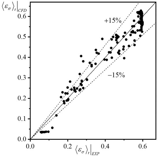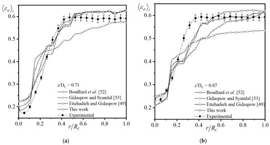 Considering that the experimental cross-sectional time-averaged solid holdup distributions are symmetric, it is possible to estimate an azimuthal average of the fields, in order to obtain a local comparison with the model predictions. The azimuthal average is estimated according to Equation (31).