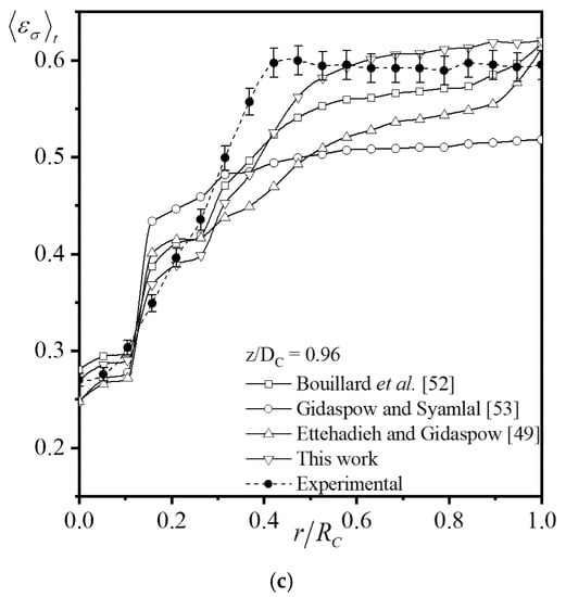 Simulations were run using the different modulus of elasticity sub-models listed in Table 1 and compared in Figure 3. A comparison of the time averaged predicted radial solids holdup by the model using the different modulus of elasticity sub-models is shown in Figure 6a–c. As expected from the comparison in Figure 3, the prediction obtained when implementing the sub-model proposed by Bouillard et al. [43] resembles the prediction obtained when implementing the sub-model proposed in this work. In fact, Figure 6a–c shows that the difference in the predictions between Bouillard et al. [43] case and the case with the proposed model is marginal.