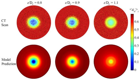Figure 7 shows a comparison between the obtained cross-sectional time-averaged solids holdup from the CT scans and the model predictions. It can be noted that there is a good qualitative similarity between the experimental results and the model predictions. From the experimental observations, the spout diameter can be appreciated to be in close agreement with the experimental observation. The implemented model considered a 2D axisymmetric domain; however, for comparison purposes, the results shown in Figure 7 correspond to the projection of the axisymmetric solution. Thus, the model predictions shown in the figure are perfectly symmetric. When compared with the experimental result, it can be seen that the symmetric behavior is also observed on the CT scans. Such symmetric behavior on spouted beds has already been reported [3,8], and was demonstrated on our previous contributions [10,13]. Hence, the results obtained by the CT scans, and the comparison shown in Figure 7 support the assumption that a 2D axisymmetric computational domain is representative enough to capture the pointwise solids distribution on a spouted bed.