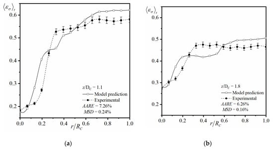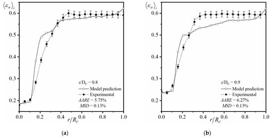 Similarly to Figure 8a–d, Figure 10a,b show a comparison between the azimuthally averaged experimentally measured radial solids holdup profile and the model prediction for a spouted bed packed with 1.41 mm glass beads, and . In these figures, it can be appreciated that when changing the static bed height, solids diameter and the inlet velocity, the model still exhibits a good predictive quality. For this case, the AARE is found to be 7.26% and 6.26% when comparing with the experimental measurements at and , respectively. The MSD is also found to be low, with values of 0.24% and 0.16% at and , respectively.