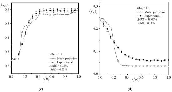 From Figure 8a–d it can also be appreciated that, as the axial position increases, the deviation in the predictions increase. In this sense, it can be seen that the AARE of the prediction shown in Figure 8d, which corresponds to the axial position , is high, with a value of 38.06%. However, the MSD obtained for the same measurements is of only 0.11%. These deviation measurements show that the model fails to properly capture the values of solids holdup profile but has a good predictive quality of the trend. Such axial position corresponds to the fountain region, where the solids flow disengages, and the solid particles fall into the annulus region for recirculation. Thus, according to the comparison with the experimental profile shown in Figure 8d, it can be interpreted that the model shows a deviation in the prediction of the width of the fountain.