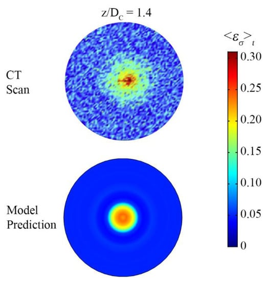 For the sake of comparison, Figure 9 shows the CT scan results and the projected 2D cross-sectional time averaged solids holdup distribution for the same case shown in Figure 8d. From Figure 9, the experimental measurements suggest that the fountain width is practically as wide as the column diameter. Thus, the time-averaged profiles show that the lowest solids holdup values are around 0.06. On the model predictions, it appears that the solids recirculation occurs in a narrower region, and thus, the quantity of solids that fall through radial positions closer to the column wall is lower. In the model predictions, the lowest holdup values obtained are around 0.03. These differences between the model prediction and the experimental measurements in the fountain region can be attributed to two different factors. The first one is, as also previously discussed, the implemented sub-models. The results shown in the previous sub-section show that the model predictions are sensitive to the implemented modulus of elasticity sub-model, and hence, an improved modulus of elasticity sub-model could enhance the prediction of the solids holdup distribution on the fountain region. Further research efforts are still required in this regard. The second source of deviations could be attributed to the sensitivity and resolution of the CT technique. Despite that, the developed CT technique has been proven to provide accurate results [10,61,62,63], it has also been recognized in literature that, despite the implementation of advanced measurement techniques, there are still systematic errors depending on the applied technique [16,17].