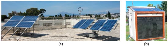 Experimental photovoltaic (PV) systems: (a) fixed-angle and two-axis sun-tracking PV; (b) building integrated photovoltaic (BIPV) test cell.