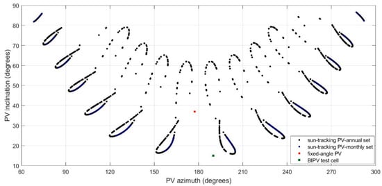 PV inclination and azimuth angles at the test positions of the sun-tracking, fixed-angle PV and BIPV systems.