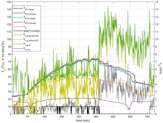 An insight into the profiles of the convection coefficients and their influence on the predicted TPVb profile is also provided in Figure 3. It may be observed that at instances of no wind the hc,g-a profile is driven by natural convection, while at instances of high wind it is dominated by forced convection coinciding with hc,g-a (forced), while at instances between 90–490 min, hc,g-a is mostly governed by mixed natural and forced convection. The forced convection profile both for the windward and leeward front side was laminar, as is expected for the majority of these cases of wind flow over flat surfaces in this range of wind speeds. At the back side of the BIPV module, forced convection is not relevant, and therefore the hc,b-a profile is only characterised by natural convection.