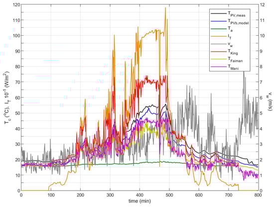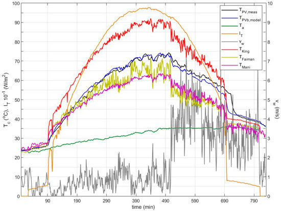 The sudden drop in the predicted temperature profiles at the 690 min is a result of a lower input irradiance due to shading effects on the pyranometer, before the shading also impacted the PV modules at 710 min. This is clearly shown in the drop in measured irradiance on the PV plane in Figure 4. At that time, the measured PV temperature experienced an exponential decay which is explained through Equation (23). The predicted TPVb profile responding to the irradiance drop also follows an exponential decay whose analysis gives a time constant equal to 5.5 min. This is in agreement with the theoretically derived τ = 1/F2 and slightly higher than the time constant 4.5 min reported in [23] for free-standing PV, as expected, since τ increases with (mcp)total and decreases with U.