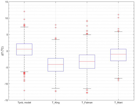 Boxplot of temperature difference ΔΤ between predicted and measured values for the proposed model in comparison to that of the other 3 models.