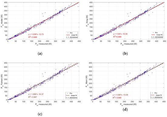 Pm predicted vs. measured for the fixed-angle PV system, by the (a) proposed model, (b) King’s model, (c) Faiman’s model, (d) Mani’s model.