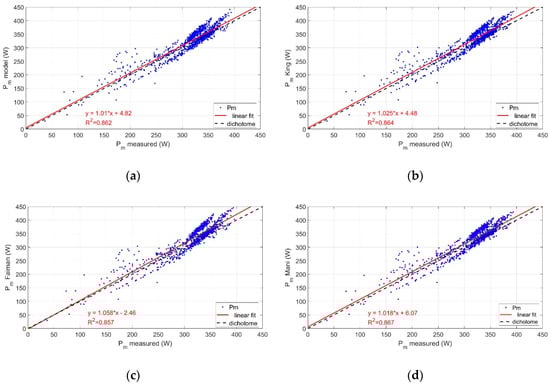 Pm predicted vs. measured for the sun-tracking PV system, by the (a) proposed model, (b) King’s model, (c) Faiman’s model, (d) Mani’s model.