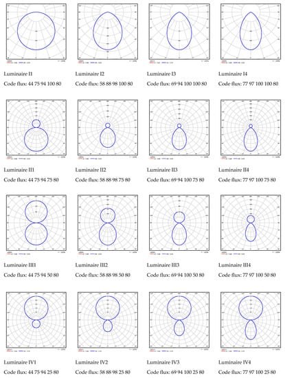 For this research, 16 types of luminaires with different theoretical and rotationally symmetrical luminous intensity distributions were selected. The luminaires representing 4 lighting classes and 4 widths of luminaire downward luminous intensity distribution were investigated. The CIE (International Commission on Illumination) luminous flux indices [36] were selected to describe the luminaire lighting class and width of downward luminous intensity distribution.