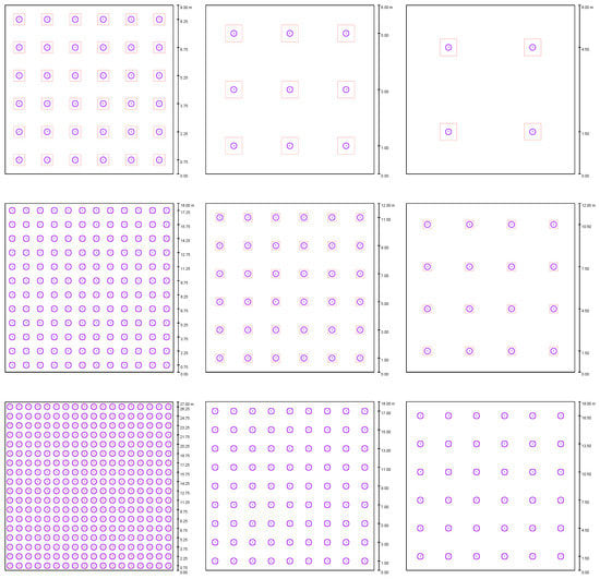 The luminaire layouts for the study. Top row, left: RI = 1.5, SH = 0.5; Top row, middle: RI = 1.5, SH = 1; Top row, right: RI = 1.5, SH = 1.5; Middle row, left: RI = 3, SH = 0.5; Middle row, middle: RI = 3, SH = 1; Middle row, right: RI = 3, SH = 1.5; Bottom row, left: RI = 4.5, SH = 0.5; Bottom row, middle: RI = 4.5, SH = 1; Bottom row, right: RI = 4.5, SH = 1.5.
