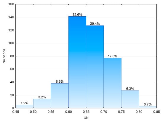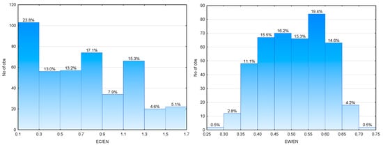 At the first stage of the research, the basic calculation results of the analyzed parameters were set for all the cases in total. Table 2 presents the list of the mean (Mean), minimum (Min), maximum (Max), range (R), and standard deviations of mean (SD). The histograms are presented in Figure 3 for UN, in Figure 4 for EC/EN and EW/EN, and in Figure 5 for UT and PN100. PN100 indicates lighting installation normalized power density with LE = 100 lm/W, LOR = 0.80, and MF = 0.8.