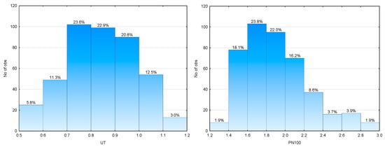 Histograms of UT and PN100 for the analyzed cases.