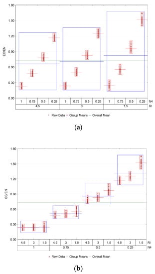 The RI index was also a parameter having a quite significant impact on the EC/EN ceiling ratio level. As a result of the changes in RI index, the changes in EC/EN ceiling ratio level were of a similar nature for the various N4 indices (Figure 6b). When comparing the edge solutions (RI = 4.5 and RI = 1.5) for N4 = 1.00, lowering the RI level caused an increase in EC/EN ceiling ratio of only 6.3%. On the other hand, when comparing the edge solutions for N4 = 0.25, the EC/EN ceiling ratio grew by 31%.