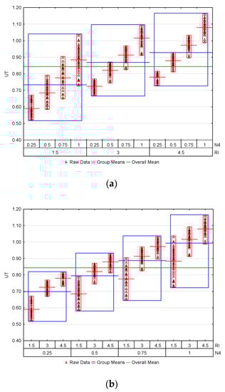 The RI index was also a parameter having a significant impact on the UT level. Regardless of the value of N4 index, the increase in RI level led to an increase in the UT index (Figure 8b). A lower impact of RI index on the UT index level occurred in the rooms with a higher N4 index. When comparing the edge solutions (RI = 4.5 and RI = 1.5) for N4 = 1.00, increasing the RI index level caused an increase in UT level of 22%. However, when comparing the edge/outermost solutions for N4 = 0.25, the UT index grew by 32%.