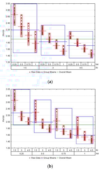 Variability plots of PN100 illustrating: (a) N4 impact for various RI; (b) RI impact for various N4.