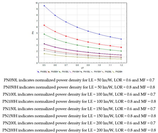 At the final stage of the research, the normalized power density levels (PN) were determined for different levels of the luminous efficacies and light output ratios of luminaires, and the maintenance factors. The calculations were carried out for the range of the obtained levels of lighting installation utilance (UT) (Table 2). Figure 10 shows the normalized power densities for the following parameter levels: