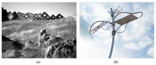 Examples of PV panels applied in urban structures: (a) Solar electric sunflowers resemble nature itself. The combination of art and technology at the top of the hillside in Northern California [8]. (b) Solar flora—an artistic photovoltaic installation in the New City Schools urban garden in Southern California [9].