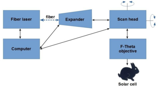 During the experiment of laser cutting, a fiber optic laser (SPI 20P) and a beam scanner were used. The scheme of the laser stand used for cells cutting is shown in Figure 2.