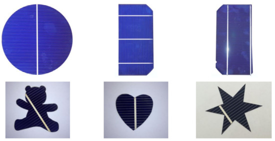 Exemplary shapes of elements which have been cut from silicon mono- and polycrystalline cells are shown in Figure 3. During the proper work of photovoltaic panels, all cells should have two busbars. However, during conducted laboratory tests, the presence of one collecting electrode in modified photovoltaic cells did not affect the obtained efficiency.