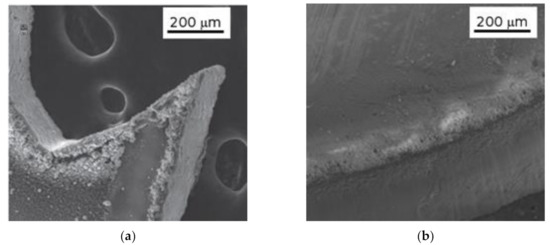 The edge quality was analyzed using the microscopic images. The degree of edge equality and the condition of cell surface (closest to the cutting edge) were checked. As it is shown in Figure 4, the edge surface is not homogeneous. Its inhomogeneity is a consequence of the minor melting resulting from the laser processing with pulses of 220 ns duration and 150 kHz repetition. With the usage of shorter and lower frequencies, such heterogeneity is not observed (Figure 4b). The microscope image, which is shown in Figure 4a shows the fragment of a cut-off element where a sharp edge is obtained.