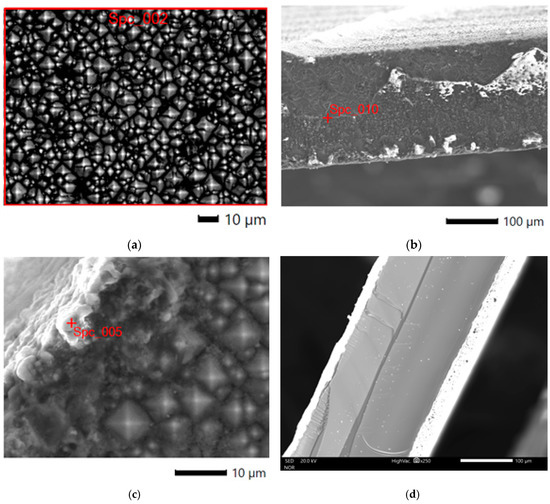 SEM pictures of the surface of a monocrystalline photovoltaic cell (a) surface without laser modification (1000× magnification), (b) the point on the surface of the cutting line cross-section of the tested sample (250× magnification), (c) the point on the cell surface next to the cutting edge (magnification 2500×), and (d) the surface of the fracture (250× magnification).