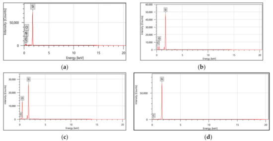 Chemical composition of the monocrystalline photovoltaic cell surface (a) without laser modification, (b) the point on the surface of the cutting line, (c) the point on the surface of the cell next to the cutting edge, and (d) the point on the surface of the fracture.